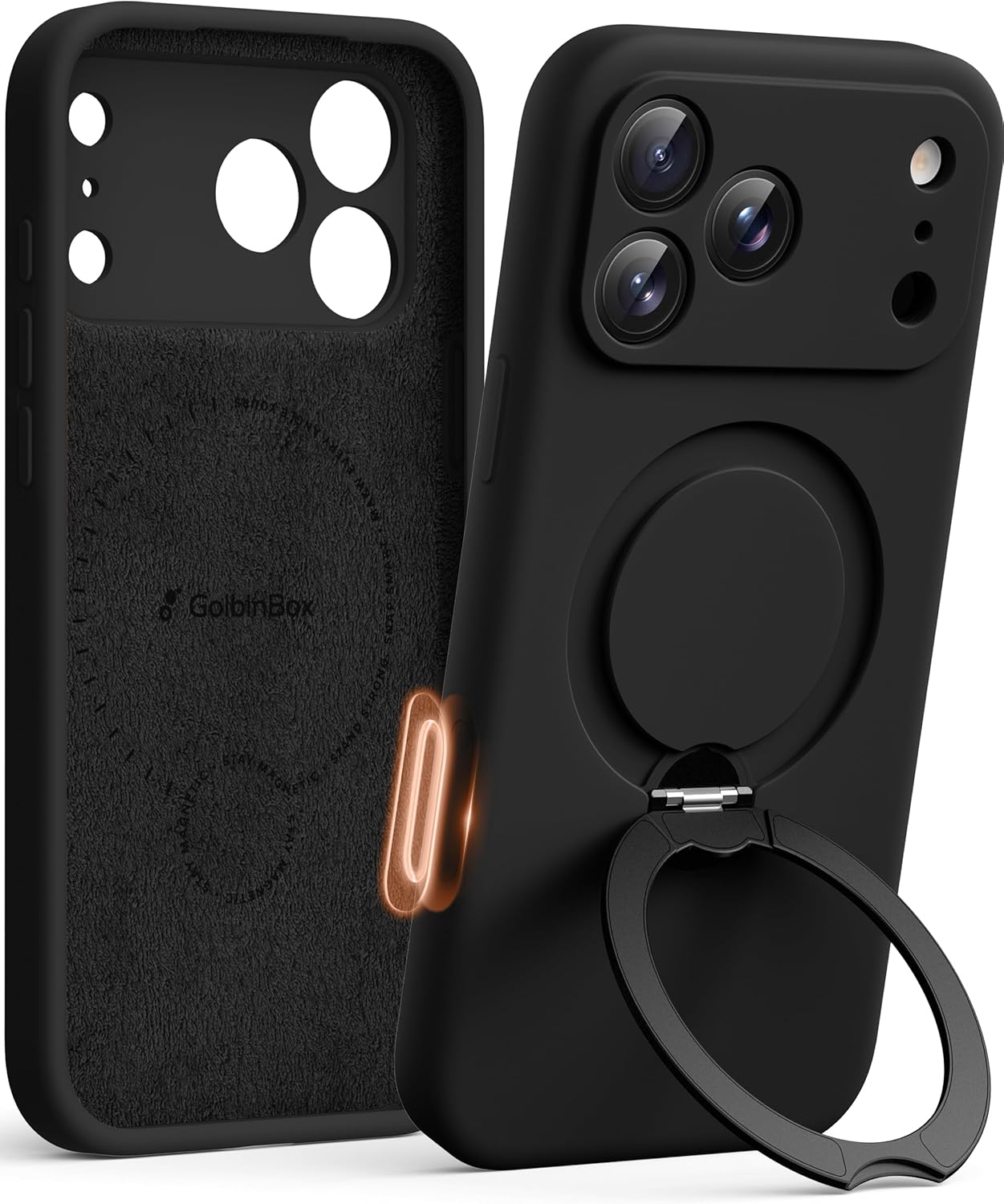 The design centers on a durable ring kickstand made from aircraft grade aluminum alloy that rotates freely and locks in place. The ring expands to multiple angles so you can use the phone in portrait or landscape with steady support, an advantage for video calls or streaming. The outer shell pairs a hard PC back with a silky liquid silicone finish for a soft hand feel and added drop resistance. For everyday handling, the inner microfiber lining helps prevent scratches and the textured silicone reduces fingerprints. GolbinBox for iPhone 17 Pro Max appears as a thoughtful combo of features rather than an overbuilt cover. You’ll notice a snug fit around ports and buttons, and according to the product notes the magnets align for MagSafe charging and accessory use. 📎