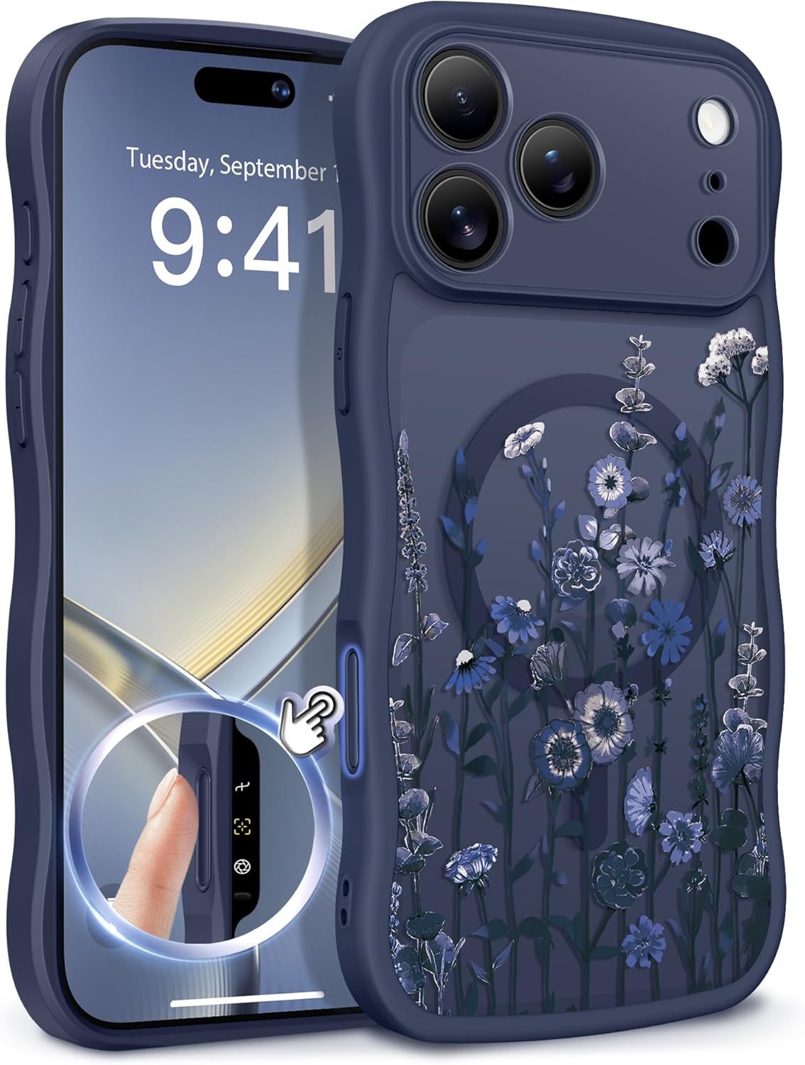 This case is specifically for the iPhone 17 Pro (6.3-inch, 2025 version). It uses an integrated magnetic ring so it’s compatible with MagSafe wireless chargers and Qi chargers. The exterior combines a matte translucent finish with a floral print, while the edge/side design leans into a curly wave look intended to feel more secure and less slippery.