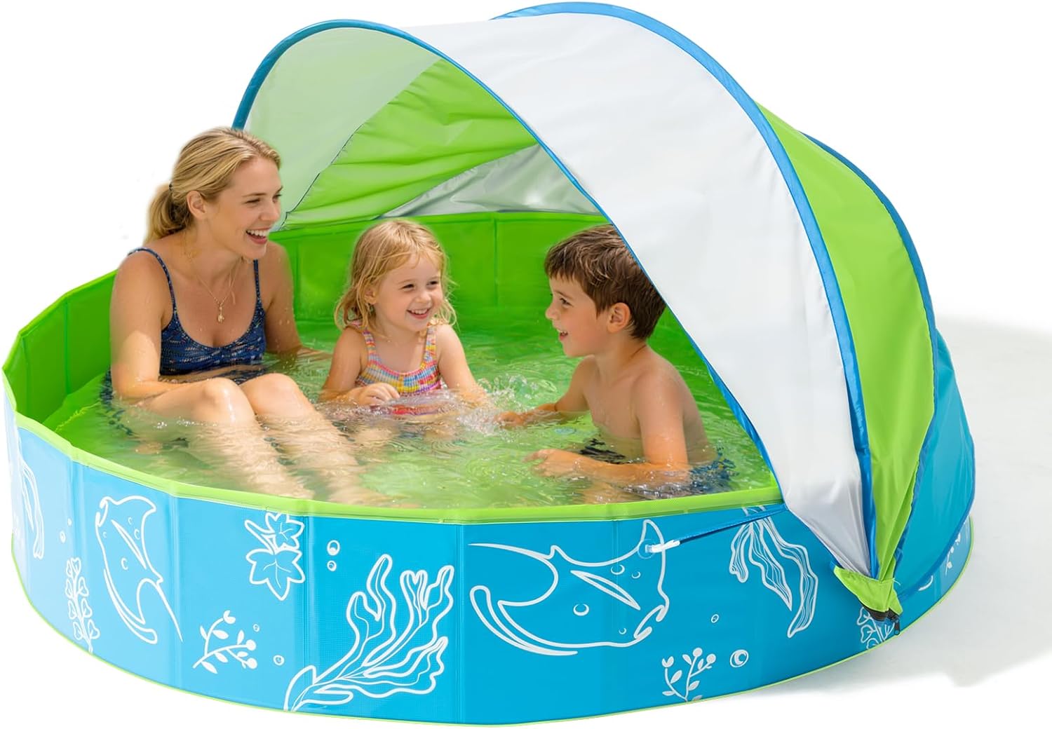 Hikiddy Foldable Kiddie Pool with Canopy (63in) – Extra Large Family Splash Pool for Outdoor Water Play