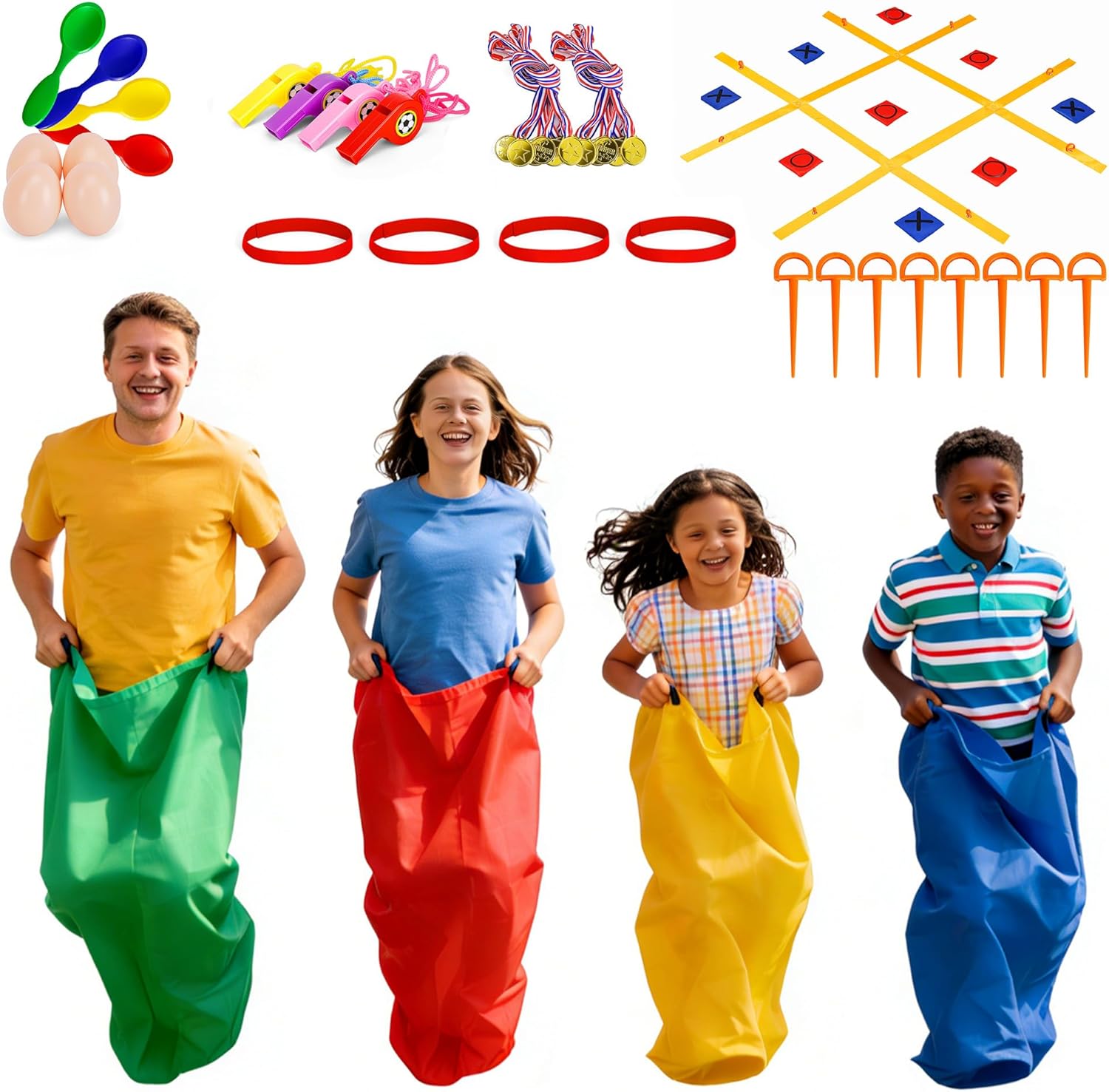 This outdoor games kit is described as a complete “backyard games” bundle featuring: - 4 colorful potato sack race bags - 4 bean bags - 4 three-legged race bands - 4 egg-and-spoon sets - whistles and winner medals