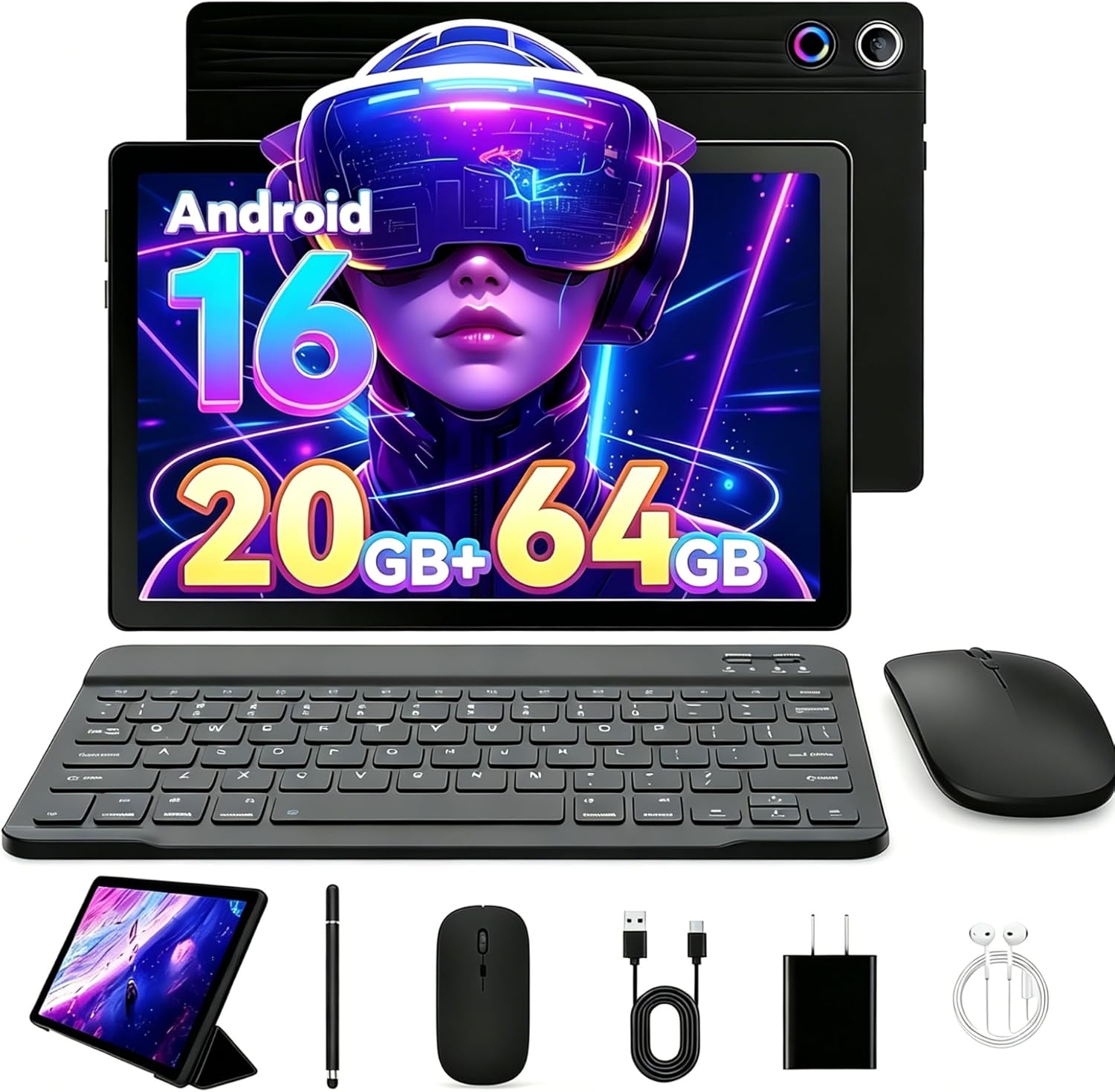 This tablet is listed with Android 16 OS, 20GB RAM, and 64GB ROM. Storage is described as expandable up to 1TB via a TF card, though the TF card is explicitly noted as not included.