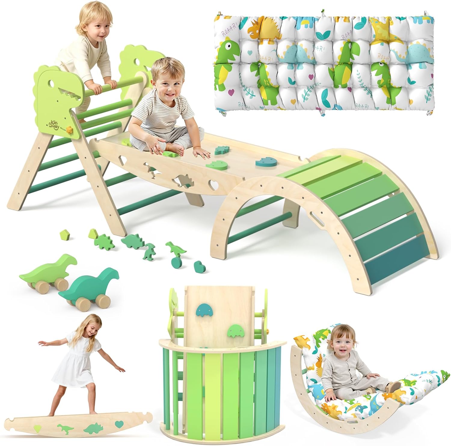 This version also leans into a dinosaur theme with a patented dinosaur design and includes a cushion for added comfort, plus two dinosaur cars to keep imaginative play in the mix. If your goal is to build an active play space at home (especially for a Montessori-inspired approach), the 9-in-1 layout is the kind of bundle parents tend to like because it offers variety instead of a single-use climbing piece.