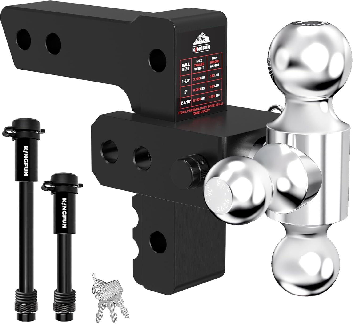 Kingfun Adjustable Trailer Hitch (2-inch receiver) with tri-ball setup, 6-inch drop/rise, up to 12,500 lbs GTW