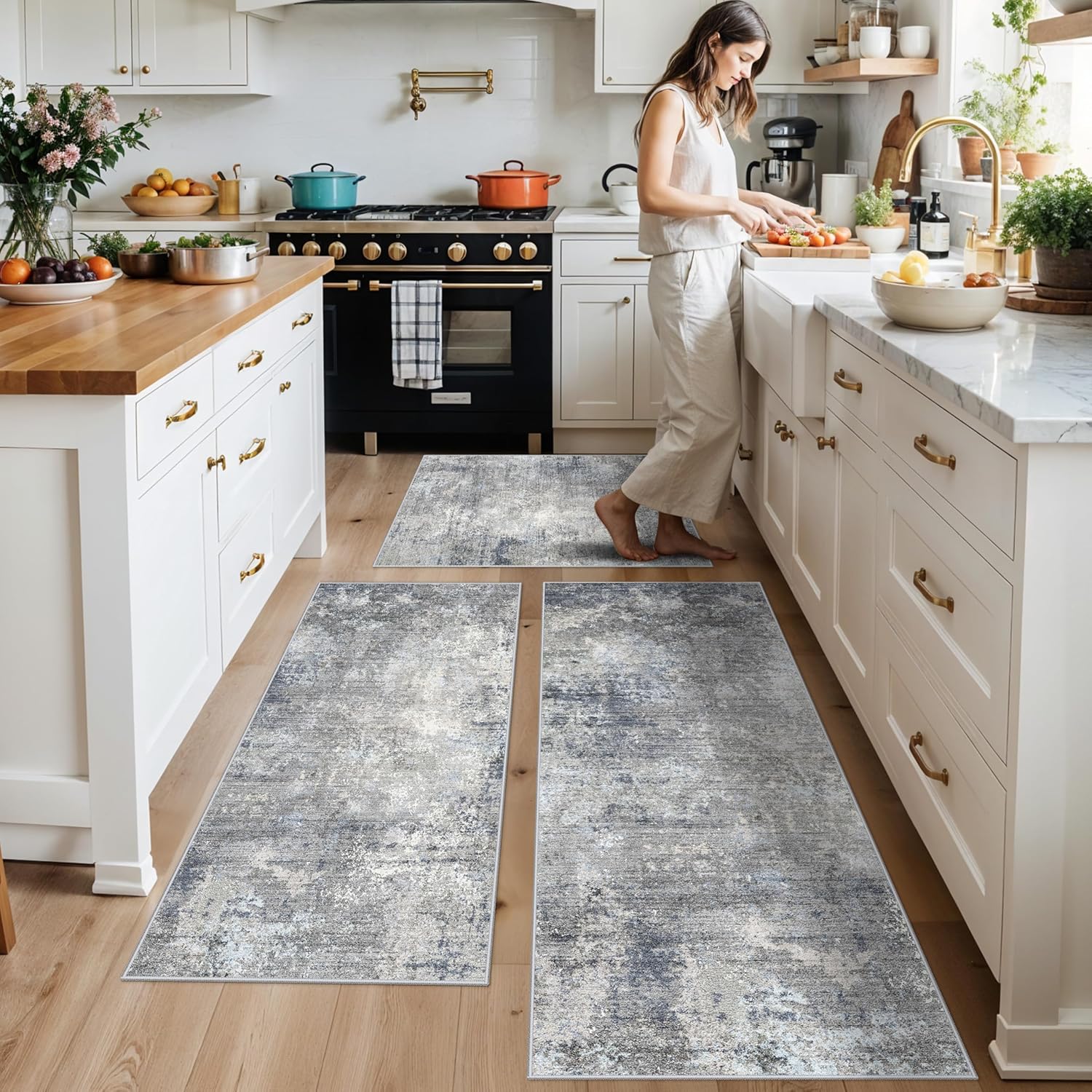 The sizes are described as fitting small-to-medium spots—specifically front of the sink, stove, and kitchen doorway—while also working in places like an RV, camper, or bathroom. If you’re trying to cover a targeted footprint rather than make the rug the entire room’s centerpiece, this set is designed for that approach.