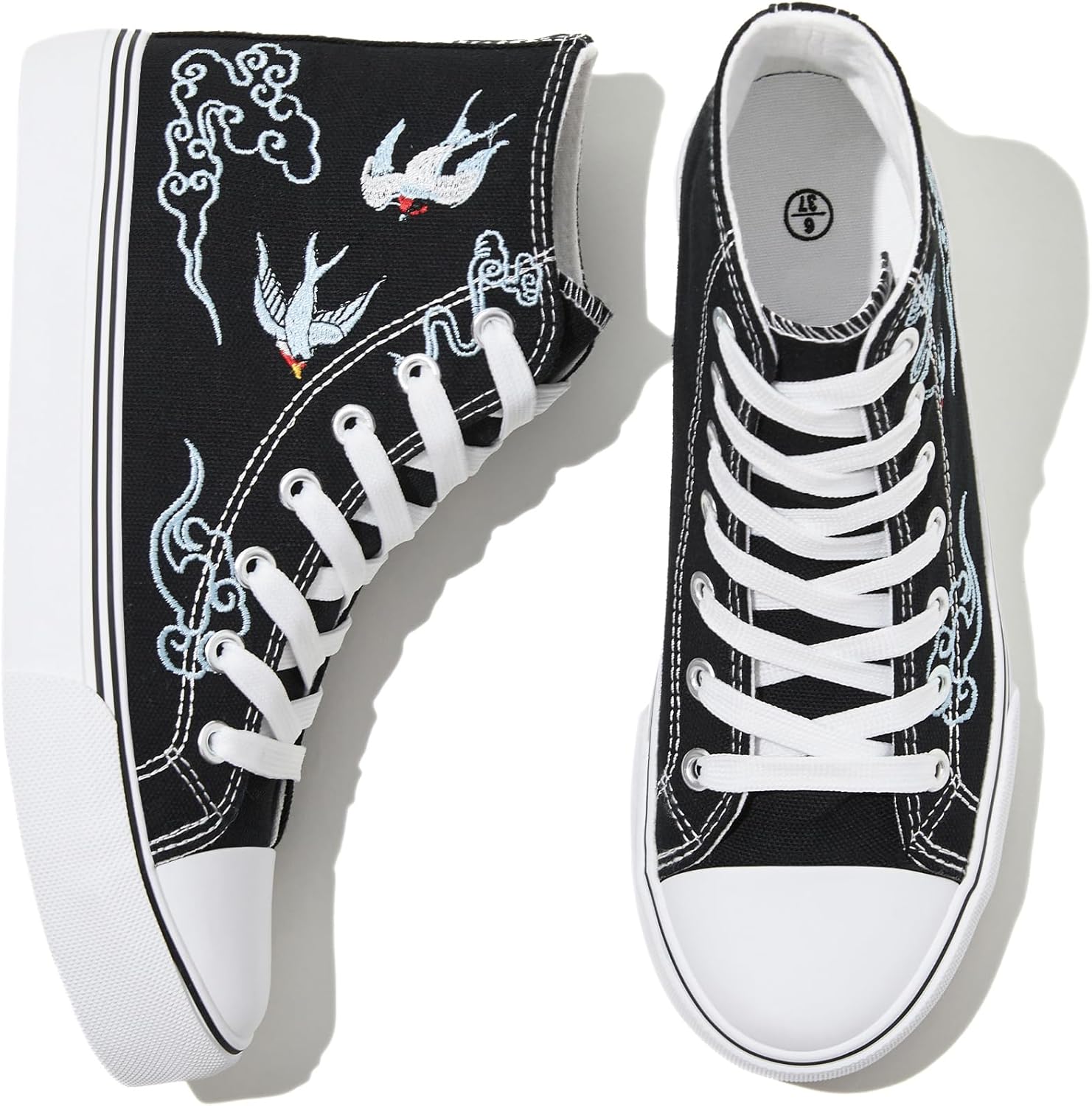 The vamp embroidery of clouds and swallows is the main design detail, supported by a classic white base and metal grommet accents.