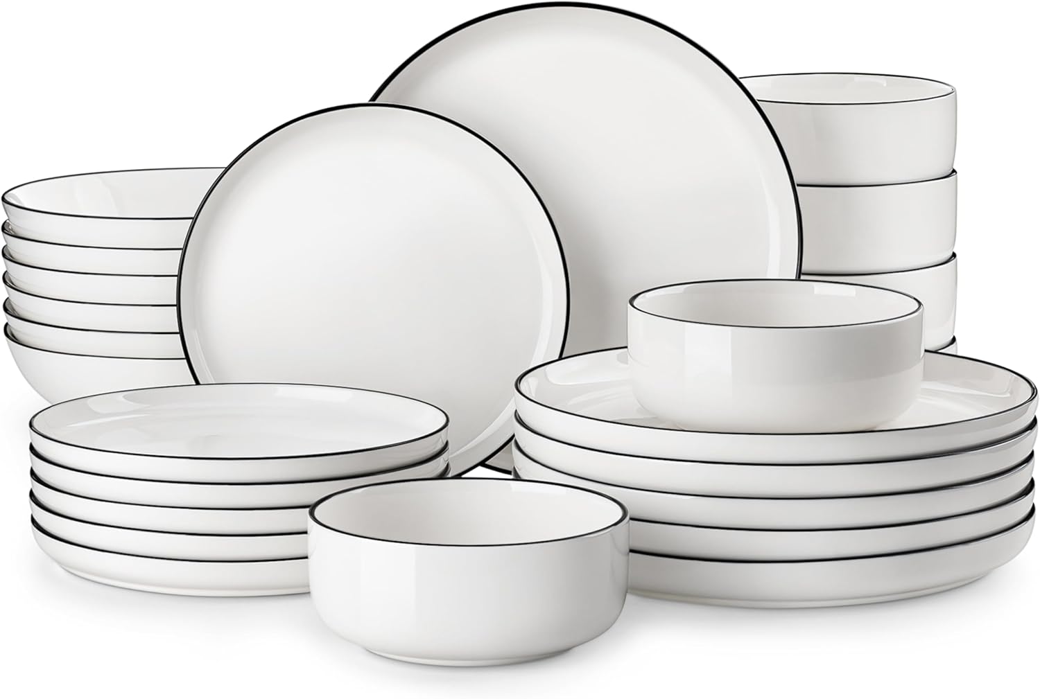 - MALACASA Luna 24-Piece Porcelain Dinnerware Set (Plates and Bowls for 8), White with Black Rim