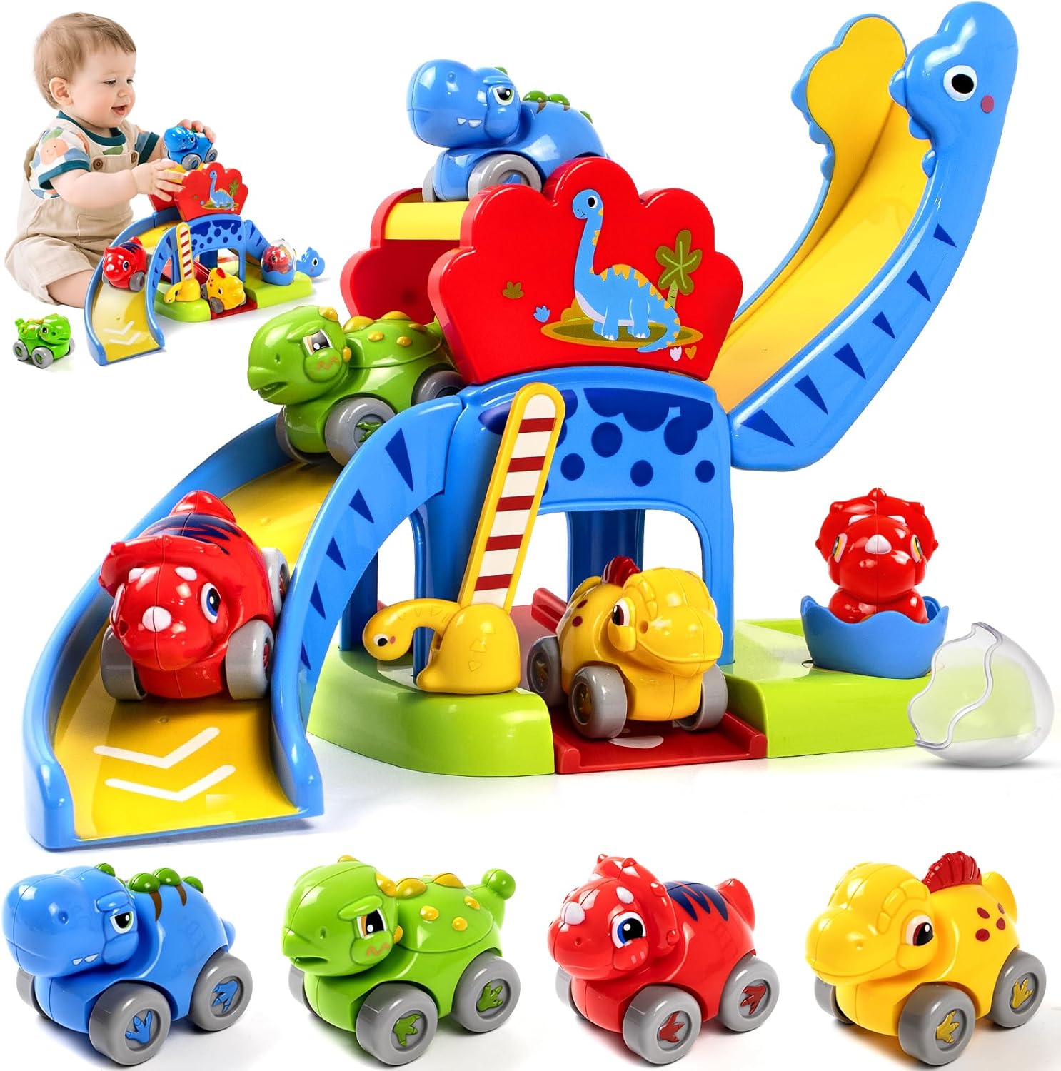 This is a push-and-slide style toddler activity: a slide ramp, four dinosaur-themed cars, and a surprise dinosaur egg. The idea is straightforward—place the cars on top, push them to slide down, and repeat. It’s marketed as a way to support early development like cause and effect understanding, focus, hand-eye coordination, and fine motor skills through play.
