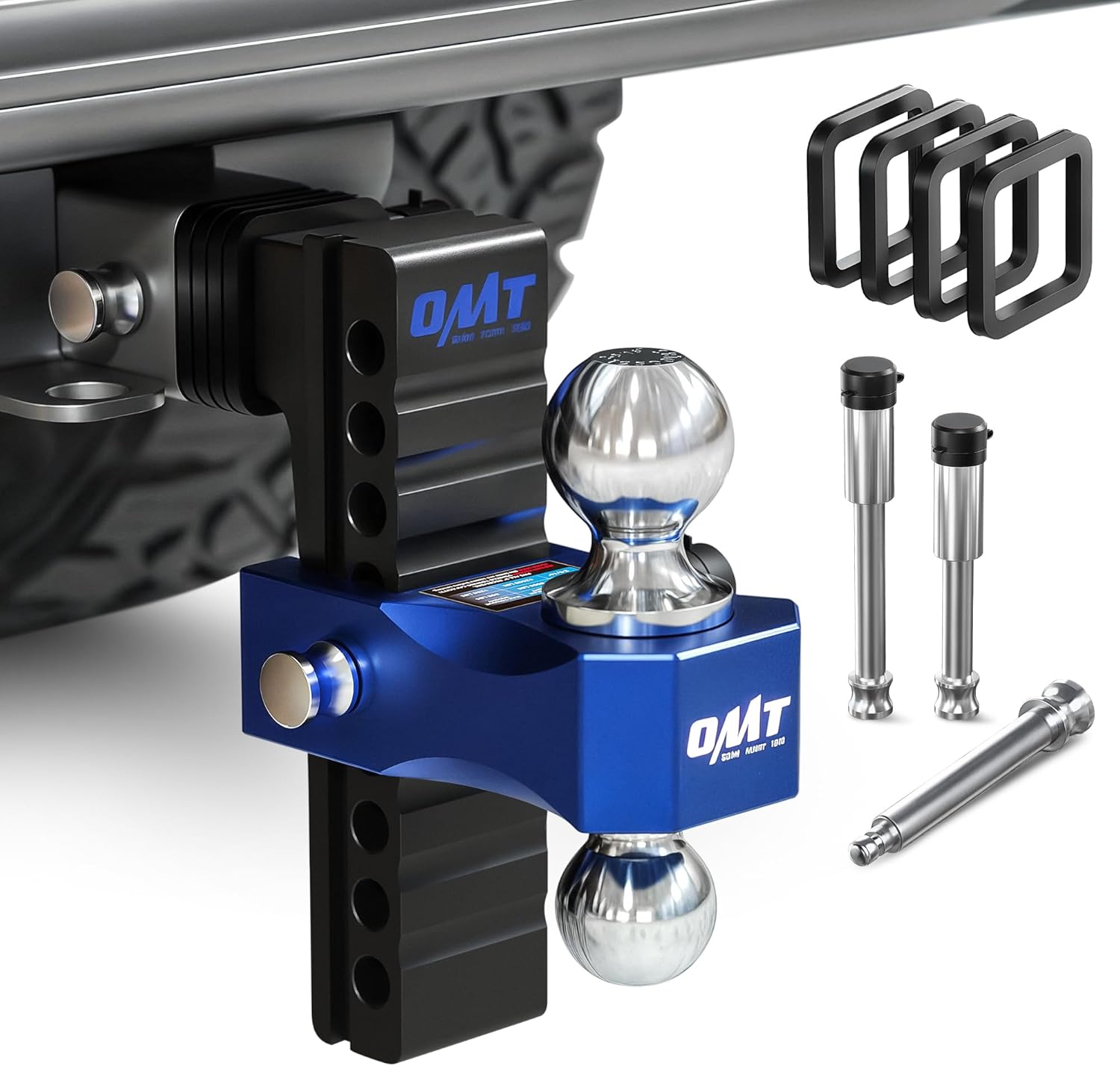 What stands out - Adjustable 8" drop/rise with 9 positions for dialing in trailer height. - Dual-ball design that supports two ball sizes with different listed capacities. - Integrated design intended to reduce wobble and help towing stability. - Heavy-duty materials (steel and aerospace-grade aluminum) with a corrosion-resistant finish. - Includes locking pins for theft resistance.