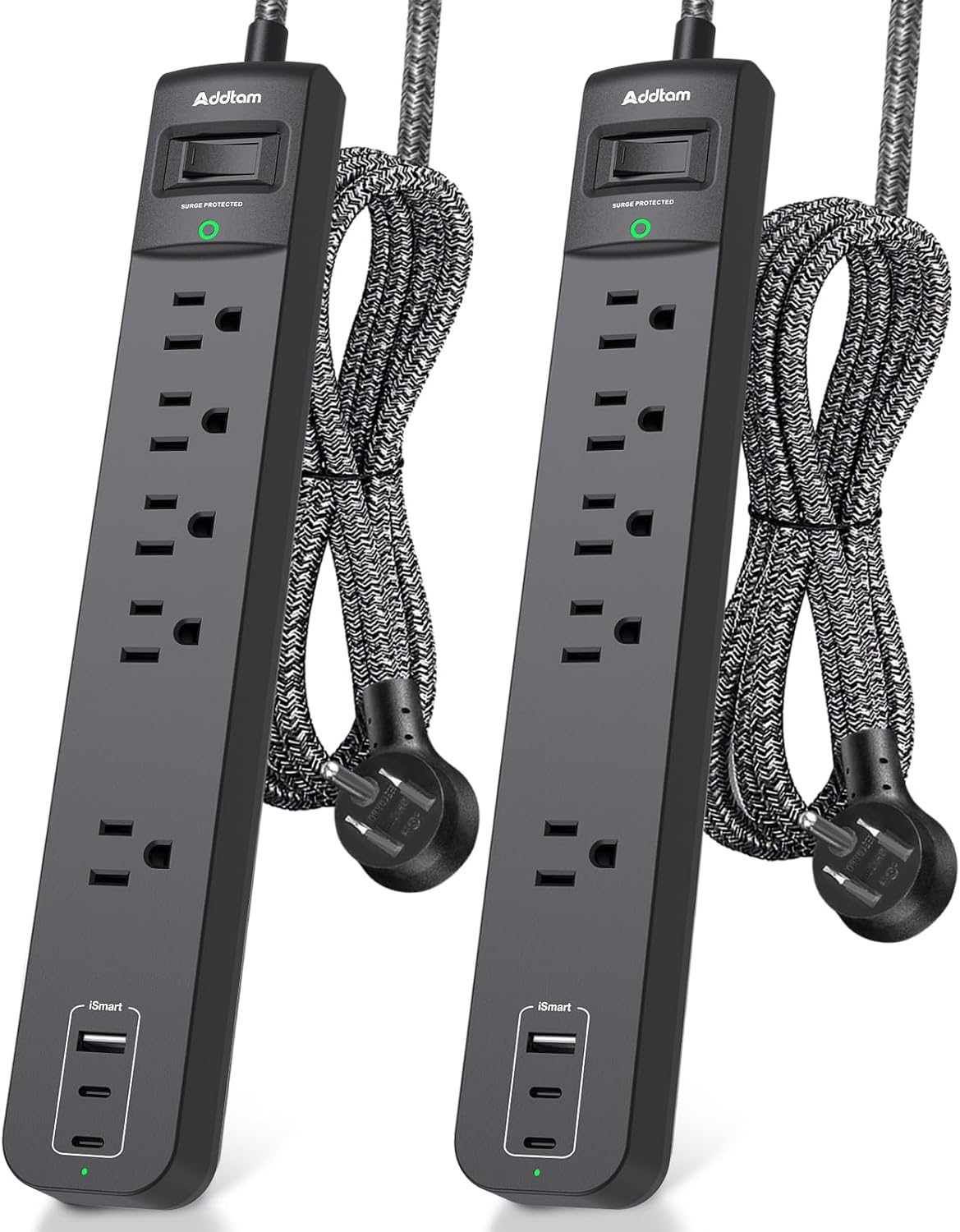 This compact power strip kit brings flexible charging and surge protection to small spaces with five widely spaced AC outlets and three USB ports. The Addtam twin pack is designed for home, office, or dorm setups where multiple devices need to be powered simultaneously, offering surge protection and a 6 foot braided cord for easier placement.