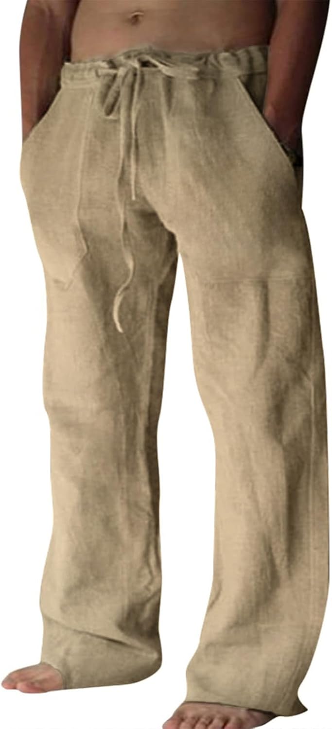 These are men’s casual pants in a cotton-linen blend (95% cotton, 5% linen). The whole point is to get the lighter, more breathable feel you associate with linen, but with a softer hand than pure linen can be. The design leans relaxed: a loose fit with a straight-leg cut, plus an elastic waistband with an adjustable drawstring.
