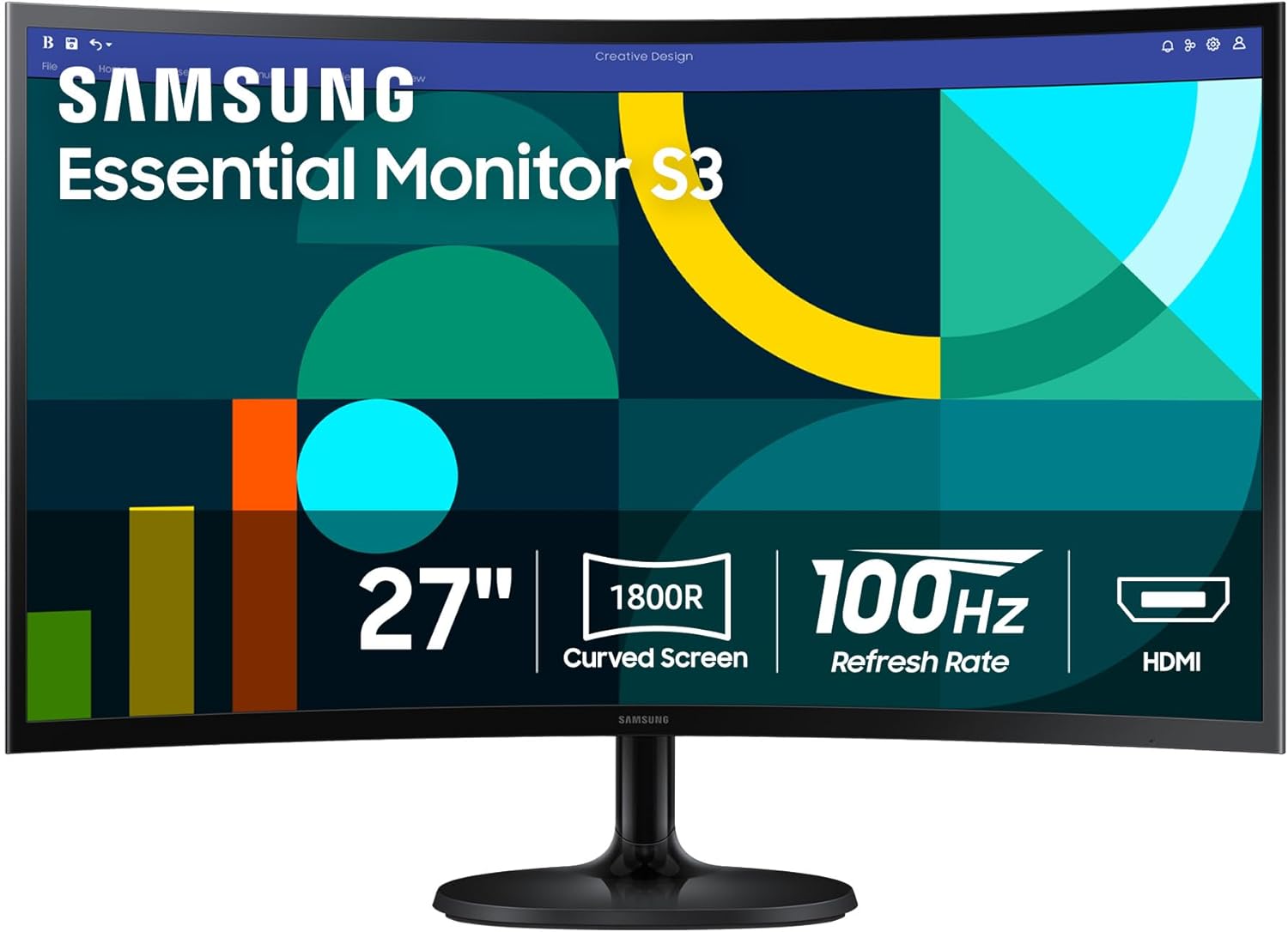 Samsung 27" Essential S3 (S36GD) Curved Monitor — FHD 1800R, 100Hz, Eye Saver Mode, Game Mode (LS27D36CGANXZA)