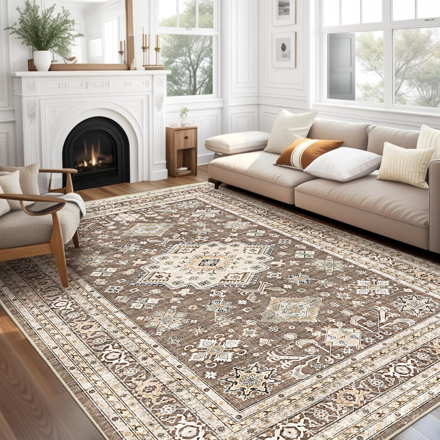 If you’re trying to warm up a room without turning your floor into a constant cleaning project, this Vintage Living Room Area Rug in a dark brown tone is built around that idea. The design leans traditional and vintage, with a distressed, farmhouse feel that can blend into a lot of home styles.