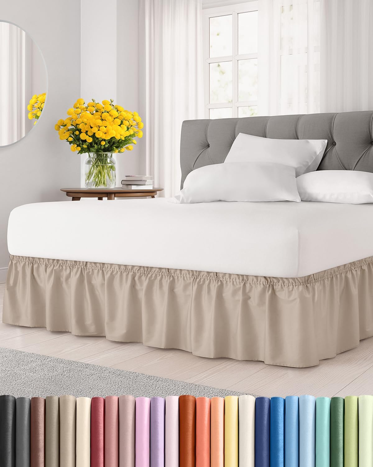 The “wrap around” design is the difference-maker. Traditional bed skirts can creep, and even small movements can pull them out of place. This one is built with an elastic wrap intended to help the bed skirt stay aligned around the base.
