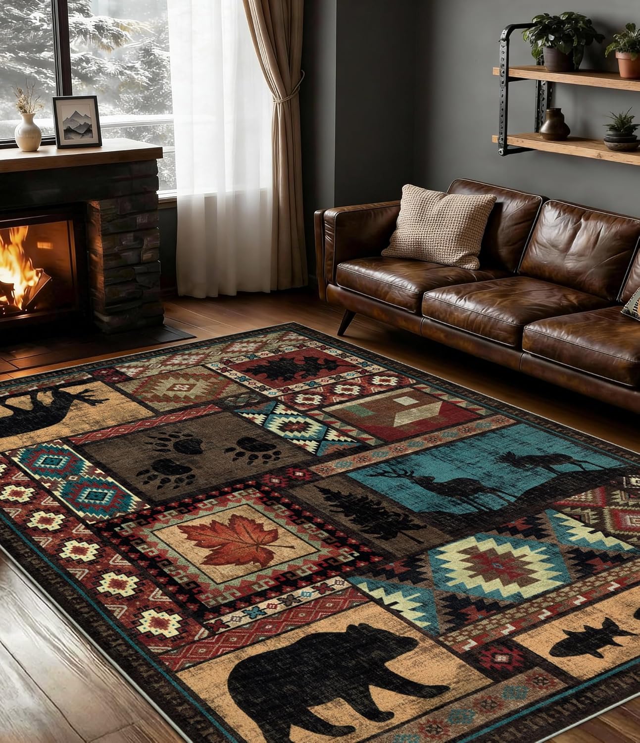 YIHOUSE Rustic Cabin Area Rug (5x7) — Machine Washable Lodge Bear Rug with Non-Slip TPR Backing
